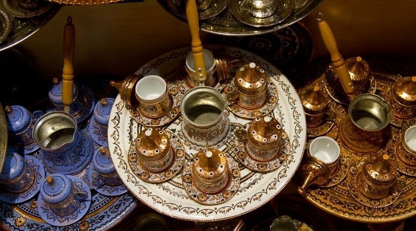Beautifully decorated cups and saucers are served via metal tray as a symbol of hospitality in Turkish homes. When purchasing a coffee set, you must ask if it can be used to drink from or just for decoration. Some beautiful sets are painted and made of alloys just for decorative purposes. If you are searching for a coffee set for kitchen use, you can easily get one in 20 Turkish liras.